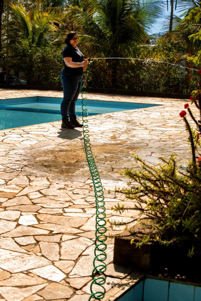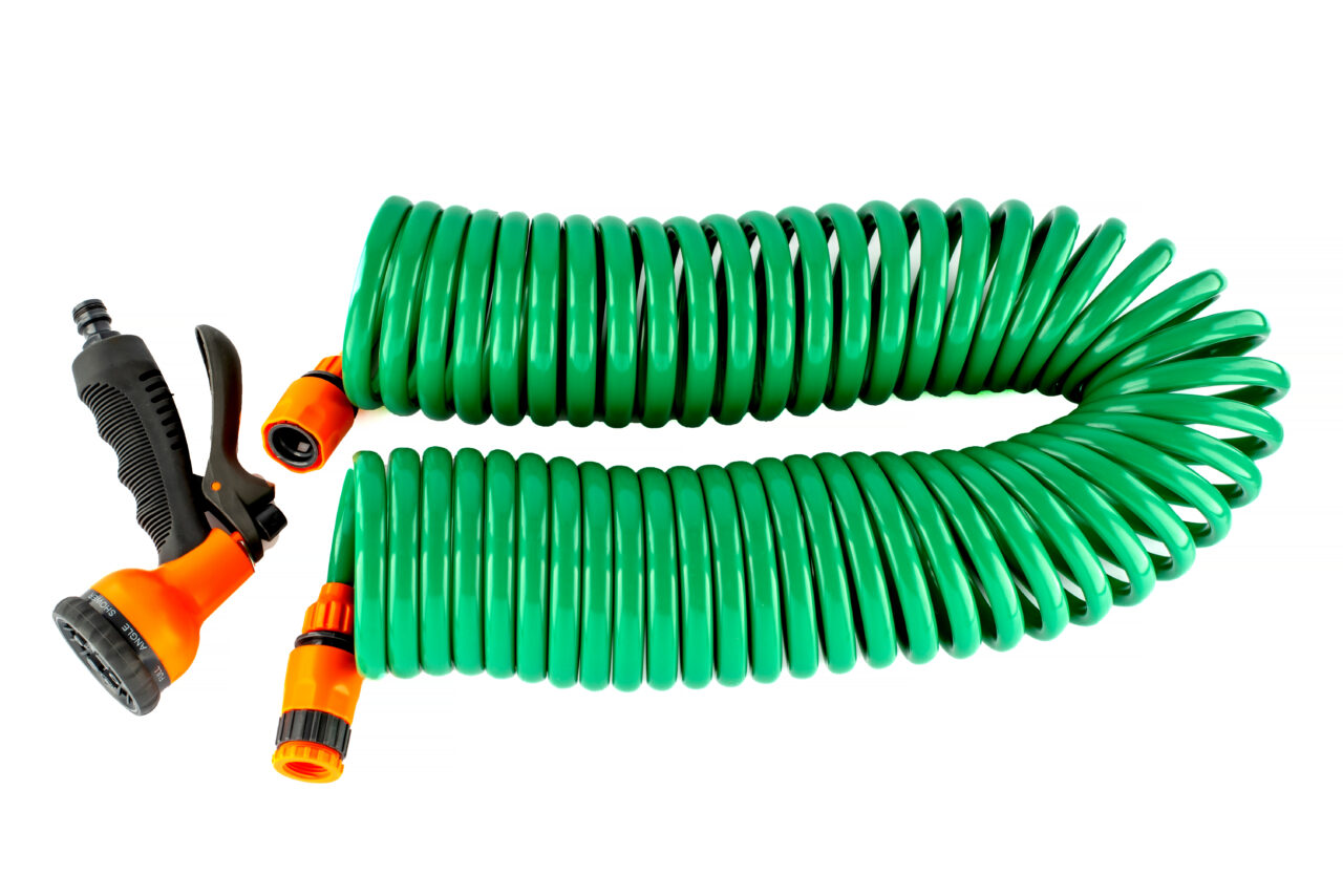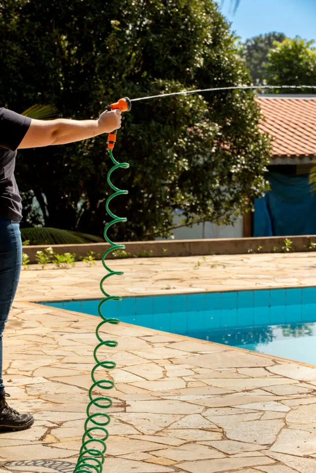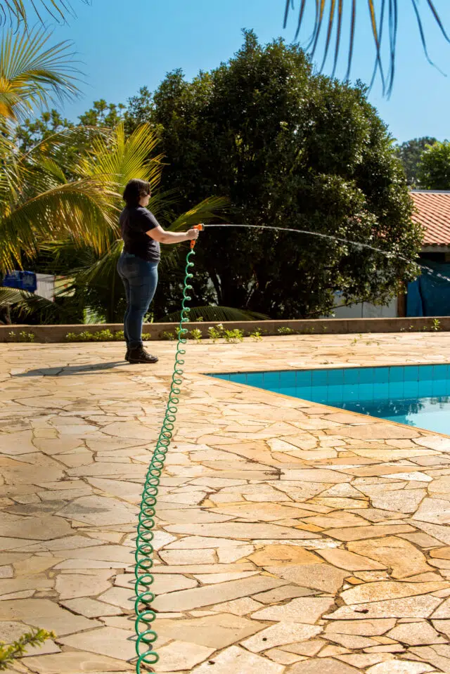 YM9032. Prática e compacta, ideal para regar plantas e limpar áreas externas. Seu formato espiral evita dobras e facilita o manuseio. Fabricada em material resistente, garante durabilidade e ótimo alcance no uso diário.